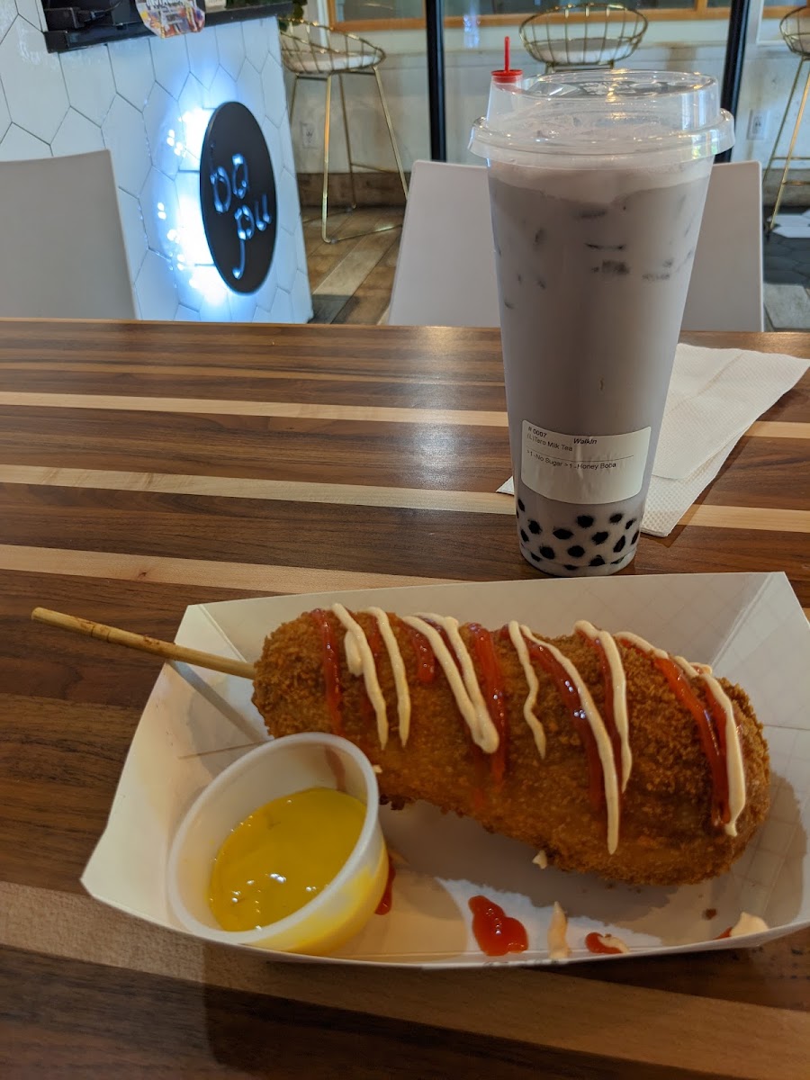 Coffee lovers can sip on the Coffee Milk Tea with Boba, a bold blend of roasted coffee and silky milk tea that energizes your day. For a savory snack, the All Cheese Korean Corndog is a must-try - crispy on the outside, cheesy on the inside, and utterly satisfying. And for something fruity and refreshing, the Blueberry Smoothie offers the perfect balance of sweetness and tang.